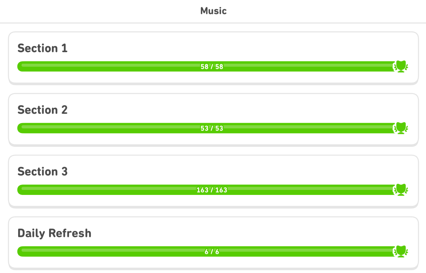 Previously I didn’t categorize Duolingo as a gaming achievement, but now I do! After 3 years, and topping leagues a long while ago, I’ve finally completed a whole ‘language’ on Duolingo (until they add more anyway). I completed using the Super subscription, which adds some more challenges I believe, but gives you unlimited tries and no ads. Where possible I got a score of a 1000 or 3 stars, without trying to take advantage of exploits.