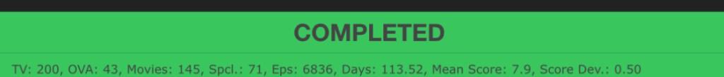 MyAnimeList Progress #1: 600 Completed, including 200 TV Series Leave a reply Yesterday I completed my 600th MAL anime entry. Just 3 years ago, I had less than 400 completed. While 50+ were shorts and music videos, I certainly watched lots of seasons.